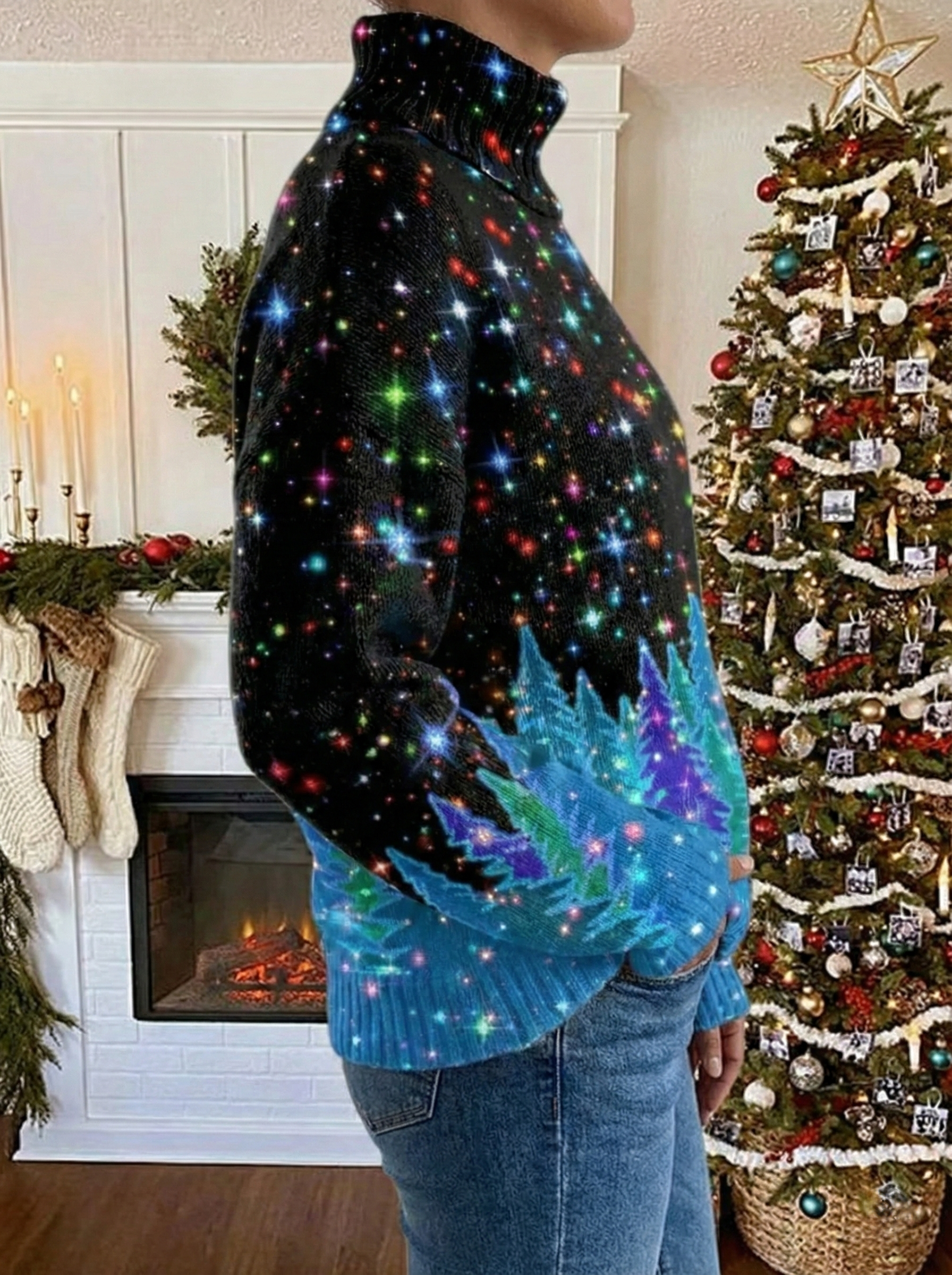 De Saraya trui is een echte blikvanger voor de feestdagen. Met haar schitterende print van fonkelende sterren en winterse bomen straalt ze pure kerstmagie uit. Perfect voor gezellige diners, borrels of knusse avonden bij de haard.